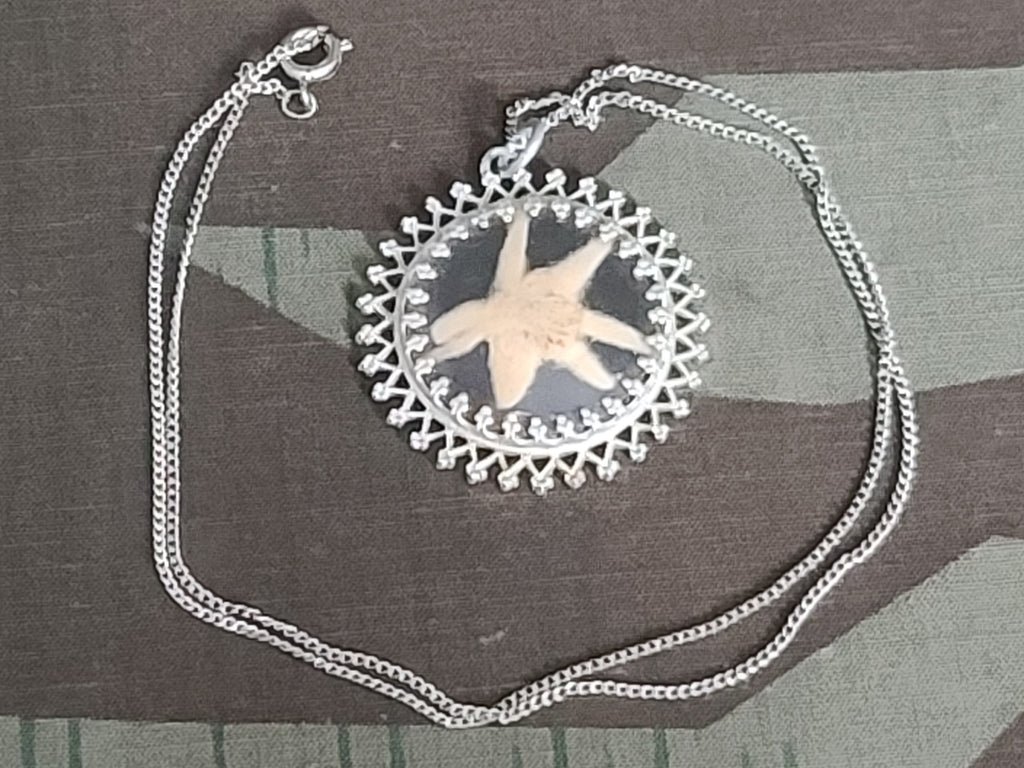 Vintage edelweiss necklace from Germany. Decorative pendant with an actual pressed edelweiss flower. It is in fairly good condition. There is some discoloration. There are no markings.