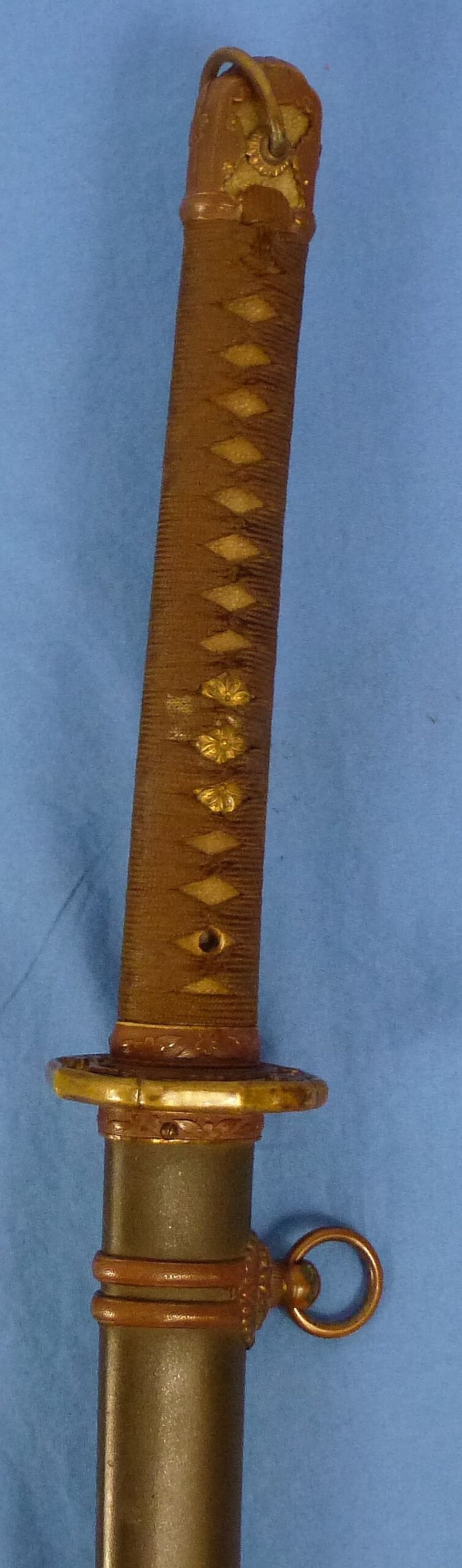 The shin gunto sword has an overall length in the scabbard of approximately 40 inches, with a blade length of approximately 26 inches. The blade exhibits some typical minor signs of age, with spots and scratches, but it is generally very clean and quite bright, while also displaying a visible and distinct temper line. The tang has a single mounting hole and it is signed 'Made by Kanematsu, a resident of Seki, Noshu'. The grip is covered in light sharkskin, and it is tightly wrapped in the traditional manner with brown fabric β showing minor wear. Beneath the fabric on each side of the grip are the standard military menuki of three cherry blossoms, with a toned gilt finish. The tsuba guard is the pierced style with four cherry blossoms within the design. The steel scabbard retains its olive brown paint. Overall the sword is in excellent condition. We photographed the sword with the retaining peg removed and we will replace it when we ship the sword.
