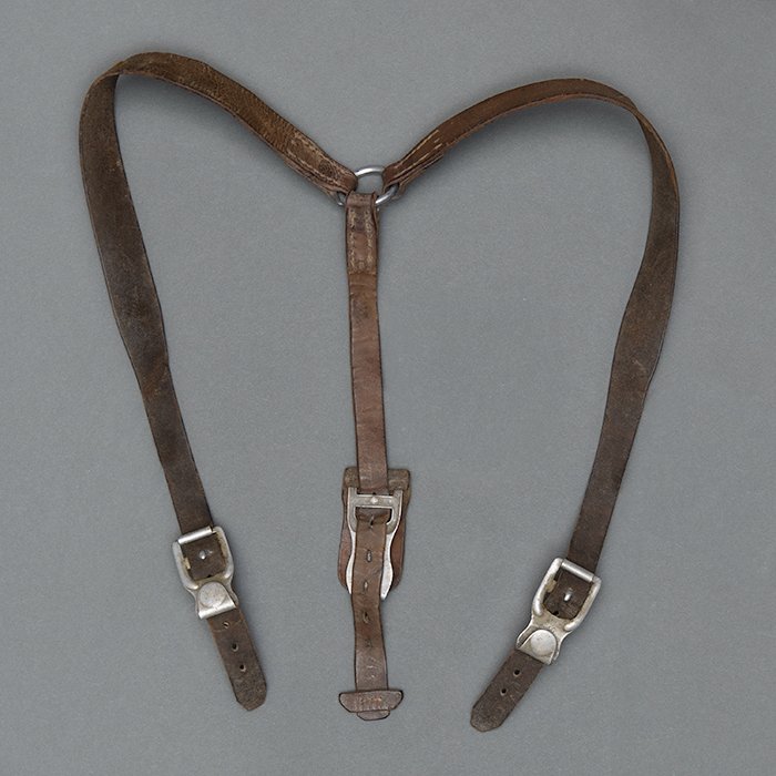 Brown leather lightweight equipment Y straps, showing service use and age, center ring and hooks are of aluminum with each of the latter being stamped D&C, complete and functional, USD $225
