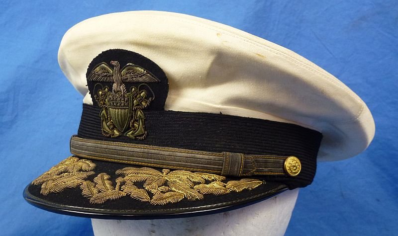 The white cotton top exhibits some soiling and age toning but it is without holes or damage. The front displays a toned gold and silver bullion officer insignia. The surface of the visor bears heavily embroidered toned gold oak leaves. The interior sweat shield is intact, as is the interior leather sweat shield. Admiral Chrisman's name and assignment are on a typed slip of paper inside of the sweat shield. Overall the cap is in excellent condition.Allan Simpson Chrisman was born in Greensboro, North Carolina, on July 18, 1906, son of John Riley and Sara Jane (Watlington) Chrisman. He attended public schools in Charlotte, North Carolina, was graduated from the University of North Carolina, with a Bachelor of Science degree in 1926, and received the degree of Doctor of Medicine from Harvard Medical School in 1930. Commissioned Lieutenant (jg) in the Medical Corps of the US Navy on June 3, 1930, he subsequently advanced to the rank of Rear Admiral to date from August 1, 1958.After a year's internship at the Naval Hospital, Philadelphia, Pennsylvania, he reported in July 1931 to the Submarine Base, New London, Connecticut, and for five months was a student at the Submarine School. He served as Medical Officer aboard the USSS-4from December 1931 to April 1933, and during that period made a tour of all Submarine Bases in connection with submarine escape training. He next served for nine months as Medical Officer of the USSBeaver, tender for Submarine Squadron Four, based on Pearl Harbor, Territory of Hawaii.From January to October 1934 he was attached to the Naval Hospital, San Diego, California, and during the four years following had duty as Medical Officer at the Submarine Base, New London, Connecticut, primarily concerned with the Submarine Escape Training Tank and Dispensary. Sea duty from September 1938 to July 1940 as Medical Officer aboard the USSRanger, aircraft carrier of the Atlantic Fleet on Neutrality Patrol, preceded graduate instruction at the Naval Hospital, Washington, DC, where he had a Residency in Radiology.He was detached from the Naval Hospital, Washington, DC, in August 1941, and during the early period of the United States participation in World War II, he served successively in the X-Ray Departments of the Naval Hospitals, Parris Island, South Carolina, and Bethesda, Maryland. In September 1942 he joined the USSPinkney, and as her Medical Officer, saw action in the South Pacific area. In August 1943 he reported as Base Medical Officer at the Advanced Naval Base, Tulagi, Solomon Islands, and there had charge of the Tulagi-Florida Medical Facilities.In January 1944 he returned to New London to be Assistant Officer in Charge of the Medical Research Laboratory. As such he assisted in submarine personnel selection for Commander Submarine, Atlantic. He was awarded a Letter of Commendation, with Ribbon, from the Commander-in-Chief, US Atlantic Fleet 'For meritorious service as Assistant Medical Officer in Charge of the Medical Research Department, US Submarine Base, New London, Connecticut, during the period from March 1944 to February 1945…'From January 1945 to July 1950 he served consecutively at the Naval Hospitals, Bainbridge, Maryland (Executive Officer); Newport, Rhode Island (X-Ray); Aiea, Territory of Hawaii (X-Ray); and Camp Lejeune, North Carolina (Executive Officer). For a year he was a student (senior course) at the Naval War College, Newport, Rhode Island, reporting upon graduation in June 1951 to Commander Submarines, Atlantic, for duty as Force Medical Officer. In September 1952 he was transferred to the Navy Department, Washington, DC, where he served as Personnel Officer, Bureau of Medicine and Surgery. On July 31, 1956, he assumed command of the Naval Hospital, Corona, California, and on December 1, 1958, was assigned additional duty as Eleventh Naval District Medical Officer, with headquarters at San Diego. In April 1961 he became Deputy and Assistant Chief of the Bureau of Medicine and Surgery, Navy Department, where he remained until relived of active duty pending his retirement, effective July 1, 1964.In addition to the Commendation Ribbon, Rear Admiral Chrisman received the World War II American Defense Service Medal with Fleet Clasp; the American Campaign Medal; the Asiatic-Pacific Campaign Medal with one engagement star; the World War II Victory Medal; and the National Defense Service Medal.