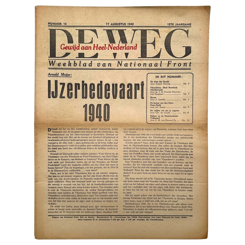 This original issue of 'De Weg – Weekblad van Nationaal Front' is number 16 of the first year, dated 17 August 1940, and represents an interesting example of Dutch collaborationist press from the early period of the German occupation.The weekly was published by the Nationaal Front movement and reflects nationalist and Greater Netherlands ideology, clearly visible in the prominent headline 'IJzerbedevaart 1940' and articles such as 'Hou en trouw aan eigen volk'and 'Groot Nederland, trek op!'The newspaper contains multiple pages with political commentary, cultural-historical articles, ideological essays, and illustrations. It also includes an article dedicated to the Belgian August Borms.An interesting collectible for those interested in Dutch collaboration movements and Second World War occupation-era printed material.Article number: 18360Originele WWII Nederlandse Nationaal Front krantDeze originele uitgave van 'De Weg – Weekblad van Nationaal Front' betreft nummer 16 van de 1e jaargang, gedateerd 17 augustus 1940, en vormt een interessant voorbeeld van Nederlandse collaboratiepers uit de beginperiode van de Duitse bezetting. Het weekblad werd uitgegeven door de beweging Nationaal Front en staat in het teken van nationalistische en Groot-Nederlandse ideologie, zoals duidelijk blijkt uit de prominente kop 'IJzerbedevaart 1940' en artikelen als 'Hou en trouw aan eigen volk' en 'Groot Nederland, trek op!'. De krant omvat meerdere pagina's met politieke beschouwingen, cultuurhistorische artikelen, ideologische essays en illustraties. Tevens is er ook een artikel gewijd aan de belg August Borms. Een interessant verzamelobject voor de geïnteresseerde in Nederlandse collaboratie bewegingen en bezettingsdrukwerk.