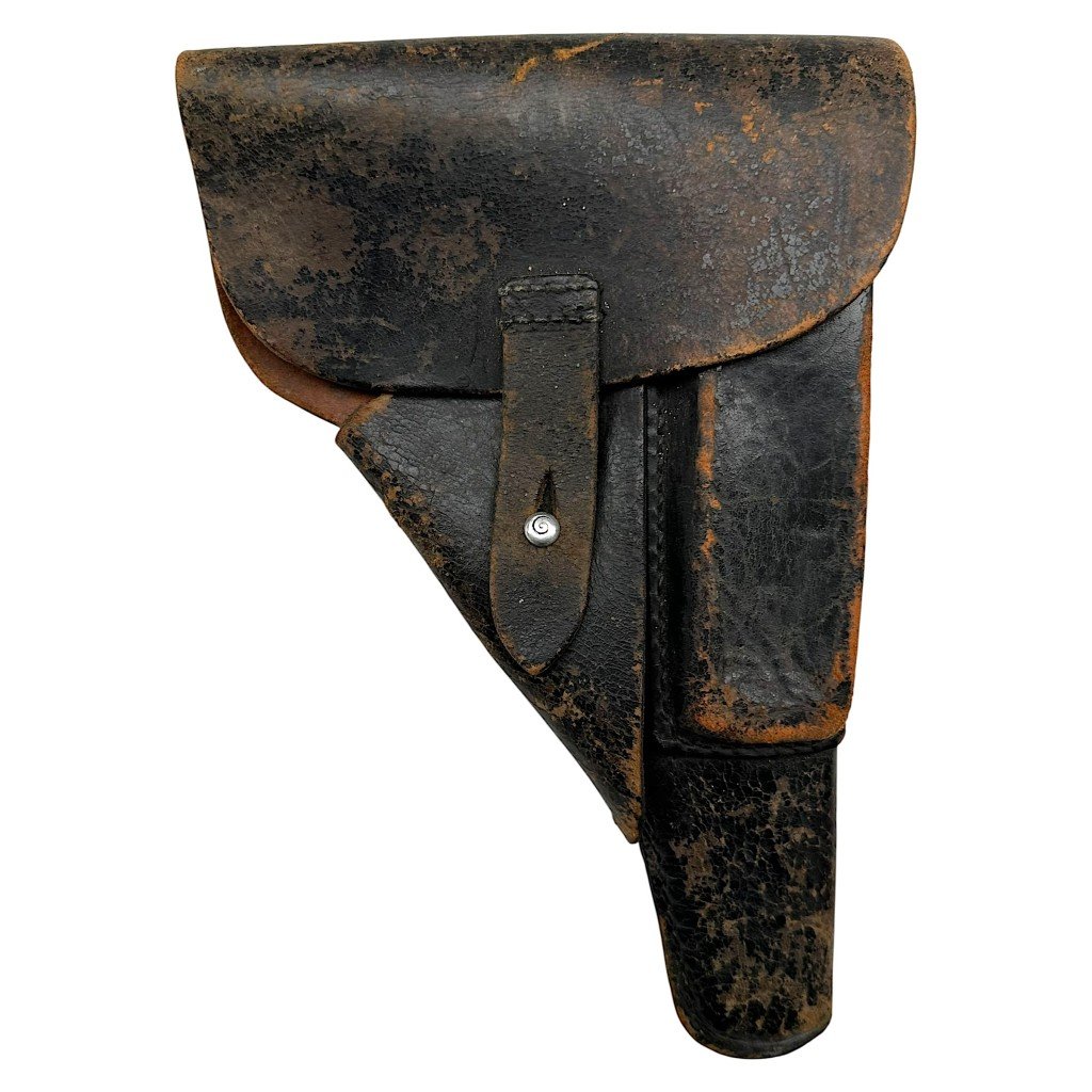 This original German P38 holster from 1944 is a late-war example made of black leather and clearly stamped 'bdr 44', the known maker code for Richard Ehrhardt, Lederwarenfabrik in Poessneck.During the war years, this manufacturer produced leather equipment for the Wehrmacht.An interesting piece for collectors of German World War II equipment, Walther P38 accessories, and Wehrmacht leather gear.Article number: 18360