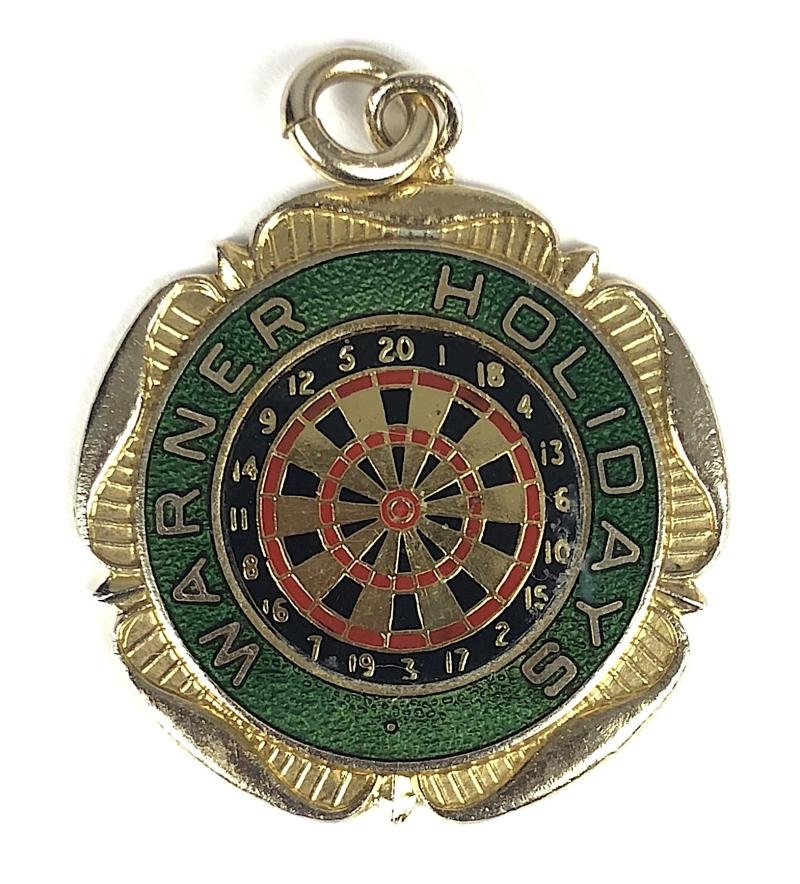 A good unusual vintage period 'Warner Holiday Camp darts match gilt medallion displaying a red, black and green enamel darboard. Very good condition, complete with original ring suspension, no stress marks or damage to enamel, gilt finish remains bright.Diameter approx 30mm.'Warners Dovercourt Bay Holiday Camp, Essex' opened circa 1937, the camp was transformed into a military base during war and for several years during the 1980s used for outdoor scenes for the BBC comedy show Hi-de-Hi!