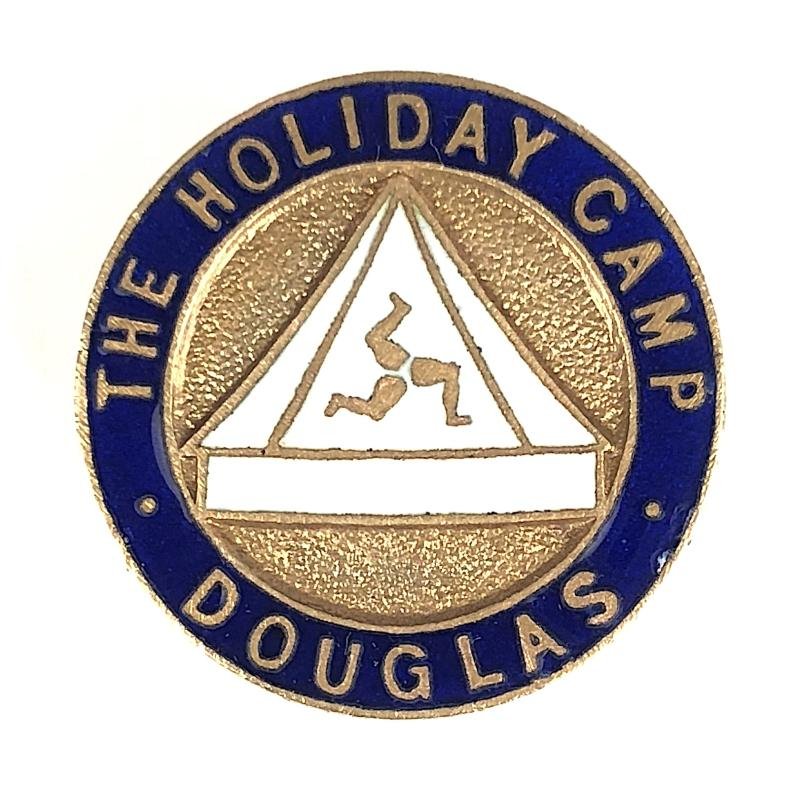 A very good original circa 1950's 'Holiday Camp Douglas membership lapel badge' gilt brass with blue enamel title surround, depicting a white enamel campers bell tent to the centre bearing the ancient 'Triskele' symbol, the reverse impressed with maker's details 'MILLER HYLTON ST B'HAM'. Very good condition, complete with original buttonhole fitting, no stress marks or enamel loss, gilt finish remains bright.Diameter approx 23mm.