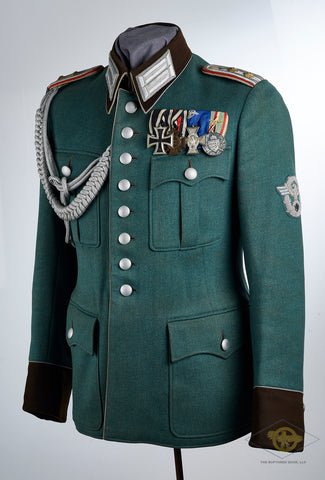 Third Reich Gendarmerie Officer Tunic-This is a dress tunic for a 1stlieutenant in the rural police. It is excellent, produced in blue green wool that is super clean. There is an eight button closure and all buttons are silver finished pebbled metal. The collar and French cuffs are chocolate brown badge cloth. There is orange piping at the closure seam, at the top of the French cuffs, at the tail and at the front and lower edge of the collar. There are four pockets with scalloped flaps. The breast pockets are pleated. There are orange badge cloth collar tabs with bright silver bullion columns. There are sew in shoulder boards with an orange badge cloth underside and a secondary underlay of brown badge cloth. The face is silver flat wire and each has a single gold finished metal pip. This is for a first lieutenant equivalent, an oberleutnant. There is a silver bullion adjutant aiguillette and a ribbon for the War Merit Cross. There are loops for two badges on the left breast pocket plus another set of loops above the pocket for a medium sized ribbon or medal bar. The left sleeve has a spectacular silver bullion sleeve eagle. The interior is fully lined in golden brown cloth that is excellent. There is a pocket on the left side plus a vertical pocket in the tail on the right. There is a collar liner. This is a size large. Excellent!Please note that any 'accessories' (i.e. medals, badges, belts etc.) are NOT included unless stated in description!