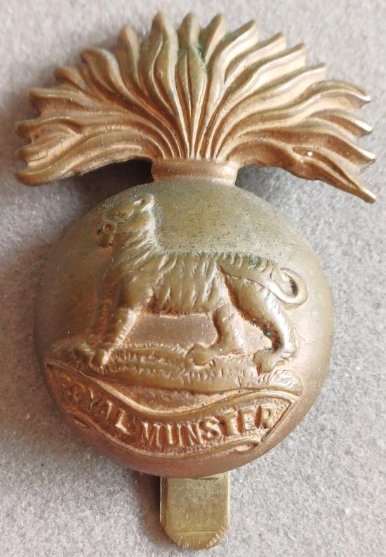 BRITISH - Royal Munster Fusiliers Gilding Metal Grenade Badge (WW1 Economy)A great example of this hat badge. Scarce hat badge.Condition: ExcellentFixings: SliderMaterial: Gilding MetalMaker / Markings: NoneSize: 42mm H x 32.5mm W