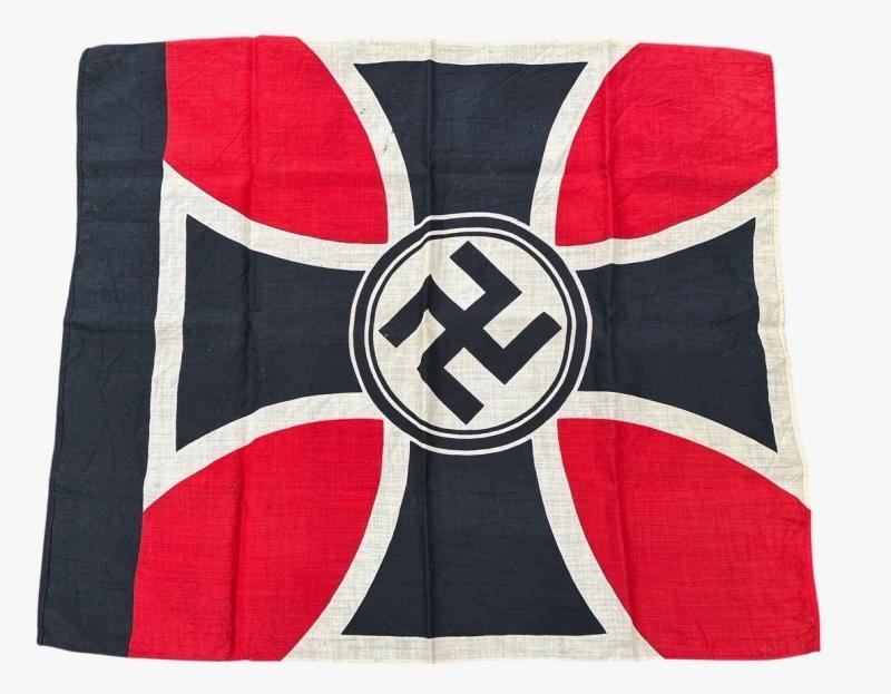'Nationalsozialistischer Reichskriegerbund' (NSRKB) Flag (Fahne). The DRKB 'Deutscher Reichskriegerbund' (Kyffhäuserbund) was formed during WWI, and was based on the DKB 'Deutscher Kriegerbund', originally formed after the war of 1870-71. On 29 March 1938 the DRKB was renamed into NS-RKB 'Nationalsozialistische-Reichskriegerbund'. Flag made of thin light weight wool, printed in red black and white. The flag has a black border which was rolled around and attached to the pole. The flag is approximately sized 135 x 112 cms.The flag is having some small damages but is in overall very good condition