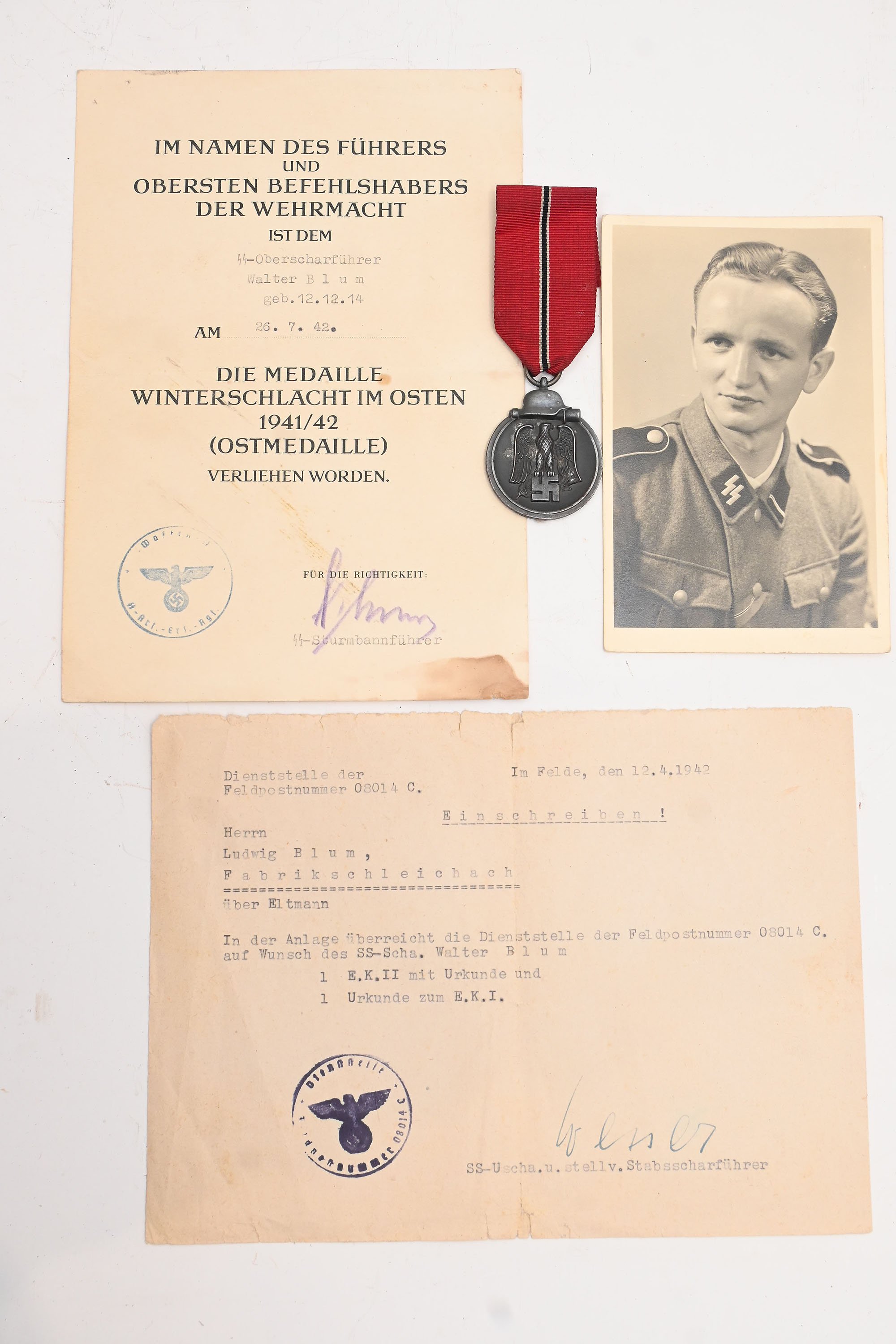 kleine ss lot bestaand uit:oorkonde ost medaille.ongemarkeerde ost medaille met origineel lint.foto van de drager.en nog een bewijs dat hij het ek2 met oorkonde naar huis heeft gestuurd.mooi verzamelwaardig setje.