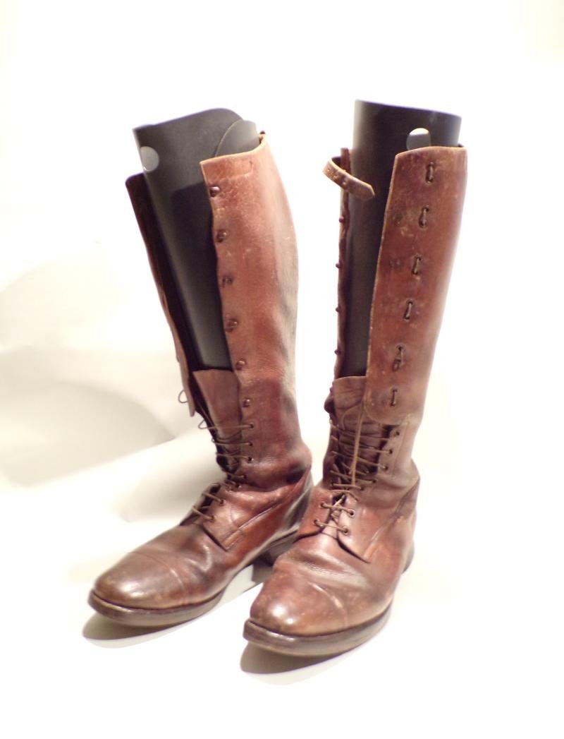 Here are a good pair of WW1 era brown leather Officers trench or riding boots, they appear from what I have seen to be a bit different to other pairs for sale as they are fully laced from top to bottom with no other straps or catches, there are no makers marks and they have been well used, the top leather is still supple and the boot rigid, they would benefit from a good clean and a feed to the leather, they should shine up very well, I estimate them to be around a size 7 or 8.