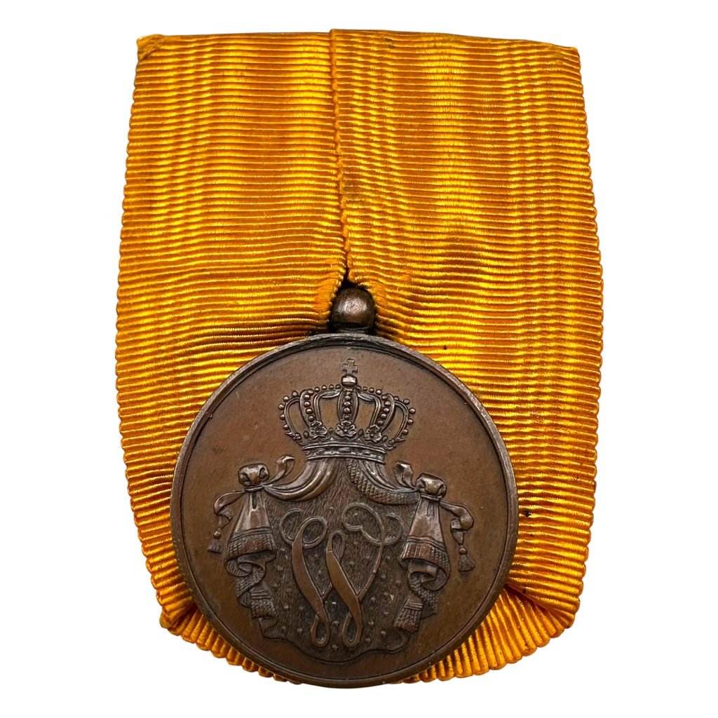 This original bronze 'For Faithful Service' medal of the Royal Netherlands Navy is a beautiful example from the pre-1940 period, awarded to naval personnel after 12 years of loyal and exemplary service. The medal is suspended from the characteristic yellow ribbon.The obverse features a crowned monogram in elegant relief, while the reverse displays the Dutch national coat of arms with anchors and the surrounding inscription 'VOOR TROUWEN DIENST – KONINKLIJKE MARINE,' clearly emphasizing its maritime origin. On the reverse of the ribbon is the original maker's label reading 'Fa. Y. Wielik – N. Einde 9 – Den Haag.'This decoration was awarded to Royal Netherlands Navy personnel who demonstrated long and dedicated service to the Dutch naval forces. A remarkable collectible for enthusiasts of Dutch naval history, pre-1940 militaria, and military decorations.Article number: 18380Originele Pre 1940 Nederlandse Koninklijke Marine 'Voor trouwen dienst' bronze medailleDeze originele bronzen medaille 'Voor Trouwen Dienst' van de Koninklijke Marine betreft een fraai exemplaar uit de periode vóór 1940, toegekend aan marinemilitairen na 12 jaar trouwe en onberispelijke dienst. De medaille hangt aan het karakteristieke gele lint.De voorzijde toont een gekroond monogram in sierlijk reliëf, terwijl de keerzijde het Nederlandse rijkswapen met ankers en de randtekst 'VOOR TROUWEN DIENST – KONINKLIJKE MARINE' draagt, waarmee de maritieme oorsprong duidelijk wordt benadrukt.Op de achterzijde van het lint bevindt zich het originele fabrikantlabel 'Fa. Y. Wielik – N. Einde 9 – Den Haag'. Deze onderscheiding werd uitgereikt aan personeel van de Koninklijke Marine dat zich gedurende lange tijd loyaal en plichtsgetrouw had ingezet voor de Nederlandse zeemacht.Een bijzonder verzamelobject voor liefhebbers van Nederlandse marinegeschiedenis, pre-1940 militaria en militaire onderscheidingen.