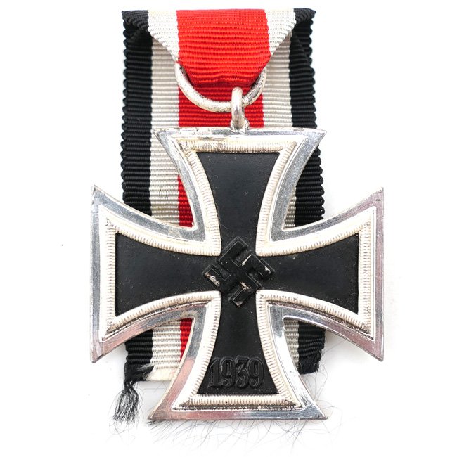 Iron Cross 2nd Class (Eisernes Kreuz 2. Klasse) with ribbon. On 1 September 1939 Hitler reinstituted the Iron Cross (First time in 1813). The 2nd class cross was for award to personnel who performed a single act of bravery in combat. The cross has a three piece construction and the cross does still have the neat so-called: 'Hochpolierte Kanten' and just shows some minor wear and great detail overall. The cross comes with its original 12cms long ribbon as found. The cross is nicely maker marked with number '100' indicating production by the company of 'Wächtler & Lange' from Mittweida. Nice example in very good condition!