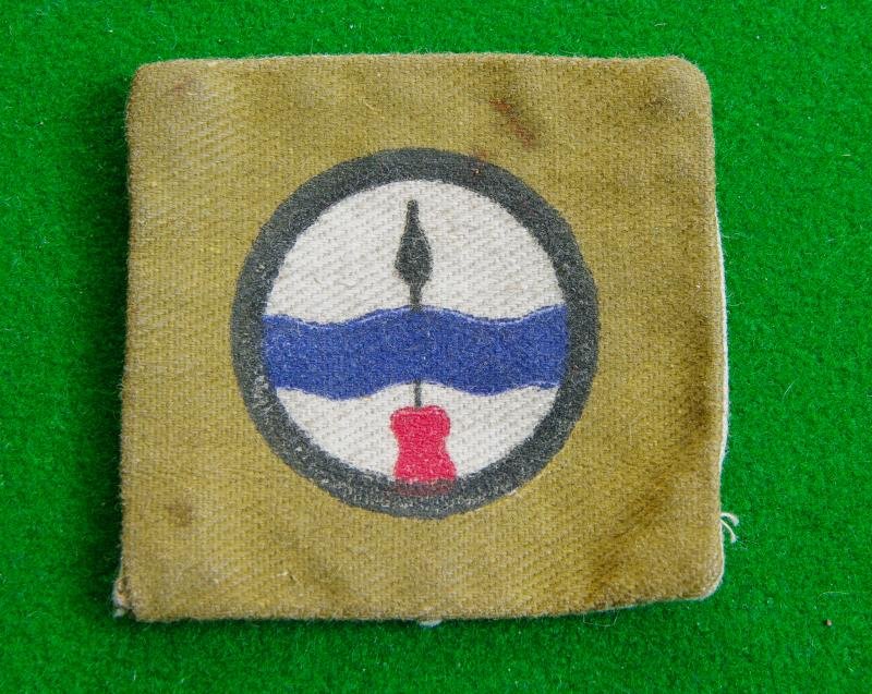 WW II painted example of a black circle with a Naga Spear and the representation of the river Bramaputra on a light khaki backing with hooks and eyes to the reverse. Worn by 202nd. {Assam} Lines of Communication Area.