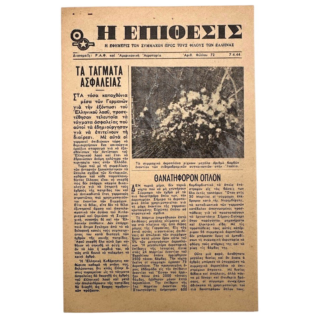 Original Allied Greek-language propaganda leaflet, dated 7 April 1944, dropped over occupied Greece by the R.A.F. and the U.S. Army Air Forces. This rare publication, titled 'Η ΕΠΙΘΕΣΙΣ' ('The Attack'), formed part of the psychological warfare campaign aimed at the Greek population during the German occupation.The leaflet contains various news reports and war updates highlighting Allied military successes. It mentions heavy bombing of strategic targets in Bucharest, Budapest and Sofia, as well as the advance of the Red Army in Romania and around Odessa. It also includes statements by President Roosevelt on behalf of the United Nations and reports on political developments within the Greek government in exile.In addition, the publication provides information about Allied air operations, German losses, and a schedule of Greek-language radio broadcasts from London encouraging the population to listen to Allied news. The content was clearly intended to boost morale, strengthen confidence in an Allied victory, and undermine German authority.A historical and rare 1944 document, highly interesting for collectors of Second World War propaganda, air-dropped leaflets and the occupation history of Greece.Article number: 18392