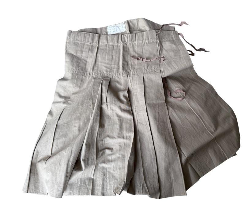 A nice i.e. minimal used Scottish Kilt Highlanders Apron. Designed for camouflaging the kilt, as well as keeoping clean in the field. This particular model compromises a a full wrap around design. Executed in khaki coloured cotton. The apron is fitted with original label. Makers marked M.C&R.Ltd 1937 dated and sized Medium. Very rare and hard to find such an early dated Scottish Kilt Apron in this condition.