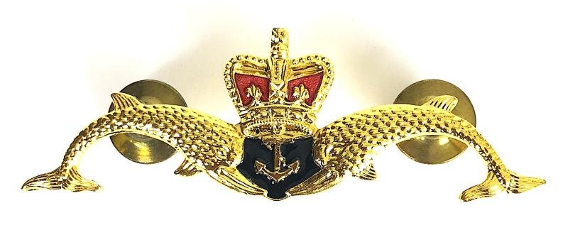 A good original post 1953 period 'Royal Navy Submarine Service gilt and enamel badge'; full size superior quality early Elizabeth II Crowned anchor, flanked by a pair of dolphins cresting. Very good condition, complete with original pair of substantially made clutch pin fittings, no damage to the enamel.Width approx 61mm.