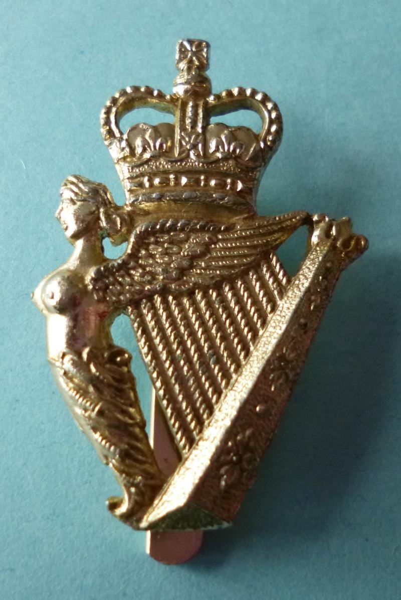 Gilt anodised aluminium Queen's crown badge with slider fixing on the reverse. The slider is stamped 'J.R.Gaunt B'ham'.