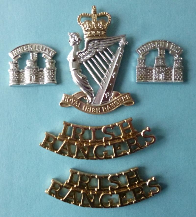 Set of Royal Irish Rangers Staybrite Cap-badge, Collar-badges and Shoulder-titles.