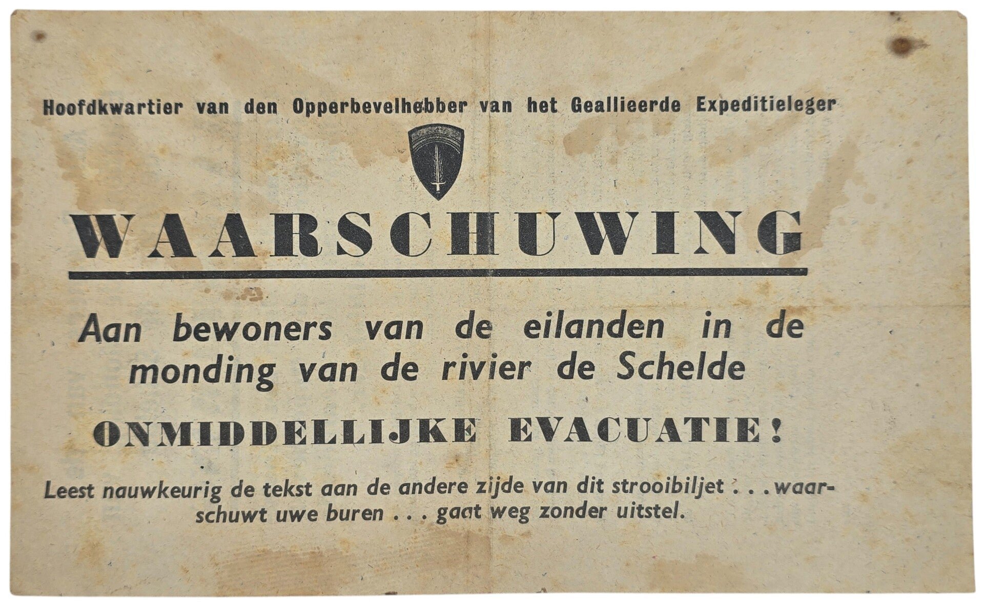 Original WW2 Allied Leaflet - ZH 3 ''Waarschuwing aan de bewoners van de eilanden in de monding van de rivier de Schelde'' (1944)British leaflet for Dutch civilians with leaflet code ZH 3. This leaflet was dropped in the Scheldt to warn the civilians to leave the Scheldt immediately. A few repairs with tape.Origineel Wo2 Geallieerd pamflet - ZH 3 ''Waarschuwing aan de bewoners van de eilanden in de monding van de rivier de Schelde'' (1944)Brits pamflet voor Nederlandse burgers met pamfletcode ZH 3. Dit pamflet was verspreid op de Schelde om de burgers te waarschuwen dat ze zo spoedig mogelijk de Schelde moesten verlaten. Enkele reparaties met tape.