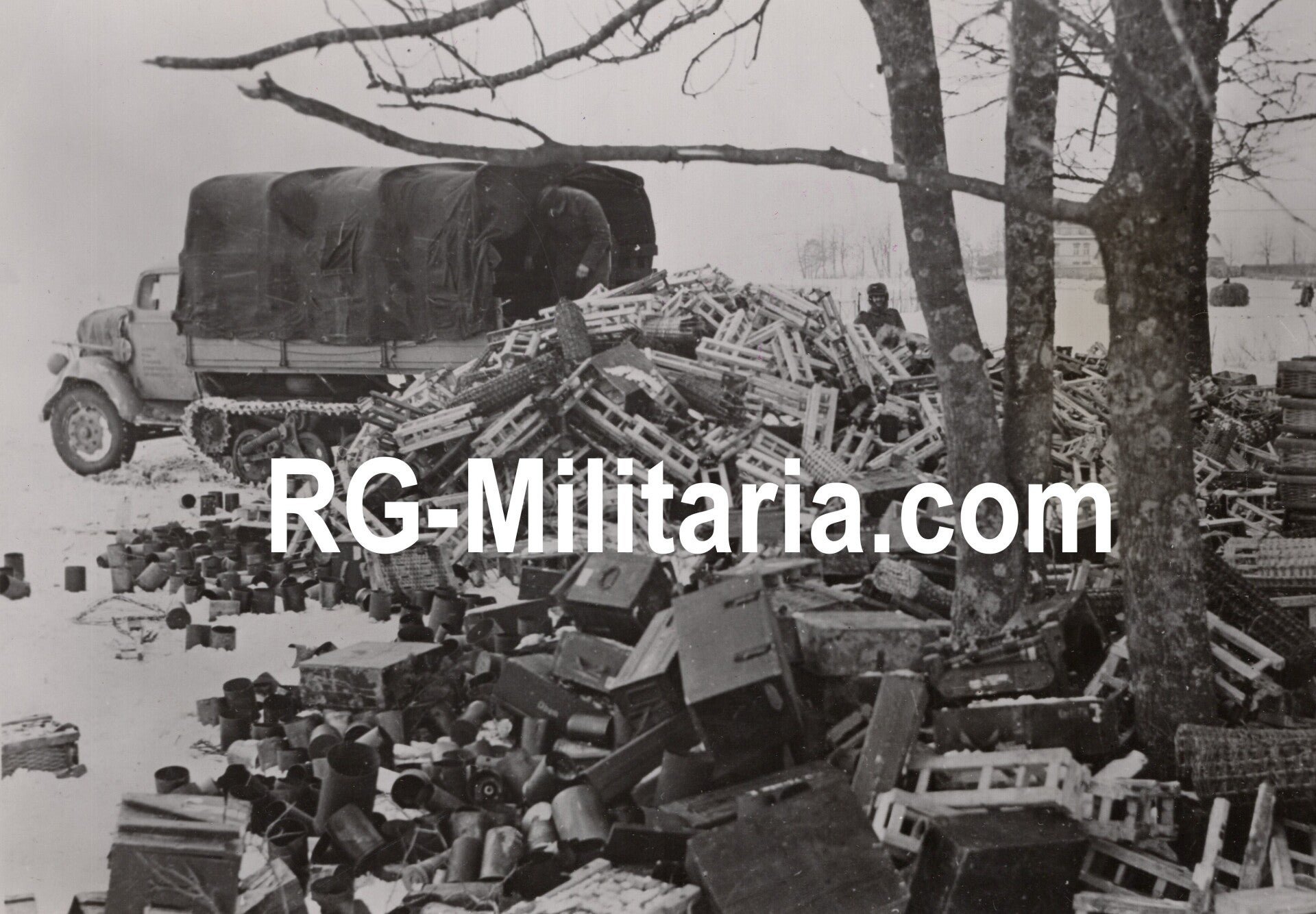 Original WW2 German Waffen SS Press Photo - Waffen SS Wiking deloading empty ammunition boxes on the Narwa Front (1944)Approximately 18 x 13 cmOriginele Wo2 Duitse Waffen SS Persfoto - Waffen SS Wiking militairen lozen lege munitiekisten uit aan het Narwa-front (1944)Ongeveer 18 x 13 cm