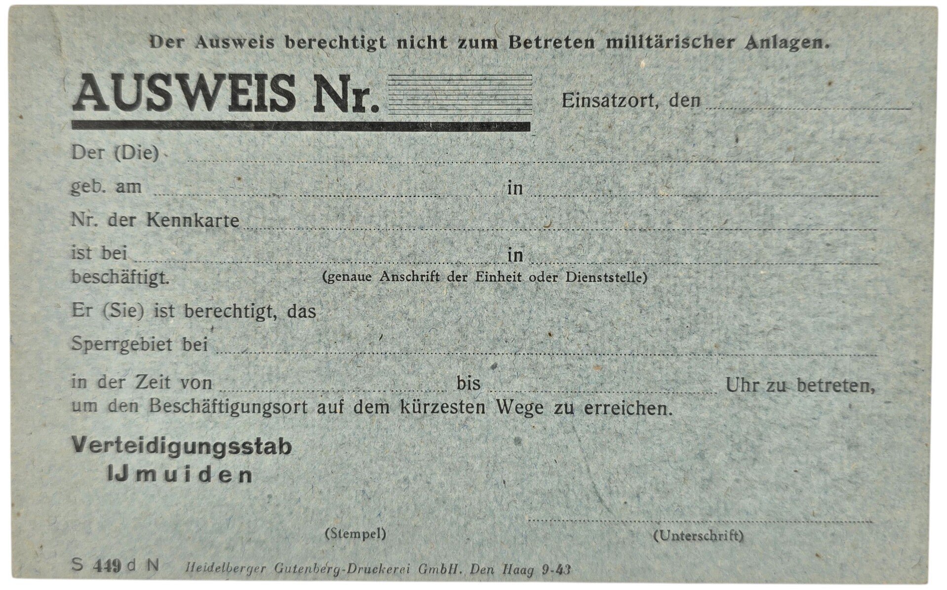 Original WW2 Dutch Document - Blank Ausweis Verteidigungsstab IJmuiden (1943)Origineel Wo2 Nederlands Document - Blanco Ausweis Verteidigungsstab IJmuiden (1943)