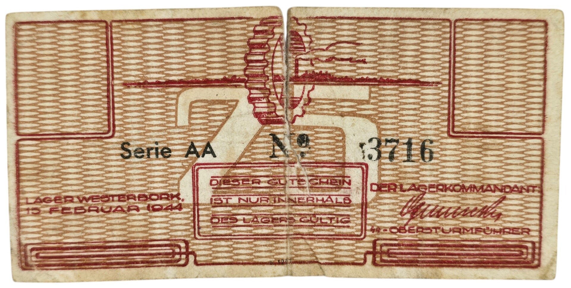 Original WW2 Dutch Document - Concentration Camp Westerbork 25 cent AA (1944)Not watermarked. Camp money. This money was used in the Concentration camp Westerbork. Almost every camp had its banknotes, people could earn them by working in the camp. With this money, people could buy things like an apple if it was in stock. Westerbork had three series, AA, BB. and CC. And the banknotes also come with and without watermarks. 10, 25, 50, and 100 were the different amounts in Westerbork.This banknote is marked 3716. It has no watermark. Tear in the middle.Origineel Wo2 Nederlands Document - Concentratiekamp Westerbork 25cent AA (1944)Zonder watermerk. Kampgeld. Dit geld is gebruikt door de gevangenen van het concentratiekamp Westerbork. Bijna elk kamp had zijn eigen briefgeld, dit kon men verdienen door werkzaamheden uit te voeren in het kamp. Met het geld kon men af en toe als het er was bijvoorbeeld een appel kopen.Het kampgeld van Westerbork bestond in drie verschillende series, AA, BB, en CC. De biljetten zijn er ook met en zonder watermerk. 10, 25, 50 en 100 cent waren de verschillende waardes voor kamp Westerbork.Dit biljet heeft als nummer 3716. Zonder watermerk. Er zit een scheur in het midden.