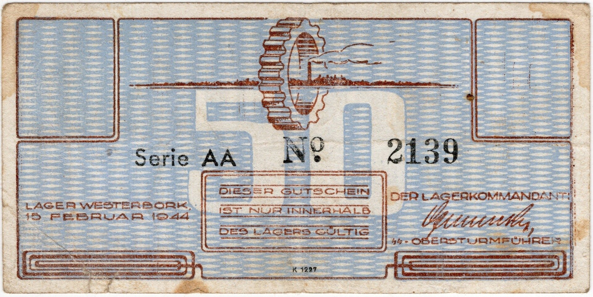 Original WW2 Dutch Document - Concentration Camp Westerbork 50 cent AA (1944)Not watermarked. Camp money. This money was used in the Concentration camp Westerbork. Almost every camp had its banknotes, people could earn them by working in the camp. With this money, people could buy things like an apple if it was in stock. Westerbork had three series, AA, BB. and CC. And the banknotes also come with and without watermarks. 10, 25, 50, and 100 were the different amounts in Westerbork.This banknote is marked 2139. It has no watermark.Origineel Wo2 Nederlands Document - Concentratiekamp Westerbork 50cent AA (1944)Zonder watermerk. Kampgeld. Dit geld is gebruikt door de gevangenen van het concentratiekamp Westerbork. Bijna elk kamp had zijn eigen briefgeld, dit kon men verdienen door werkzaamheden uit te voeren in het kamp. Met het geld kon men af en toe als het er was bijvoorbeeld een appel kopen.Het kampgeld van Westerbork bestond in drie verschillende series, AA, BB, en CC. De biljetten zijn er ook met en zonder watermerk. 10, 25, 50 en 100 cent waren de verschillende waardes voor kamp Westerbork.Dit biljet heeft als nummer 2139. Zonder watermerk.