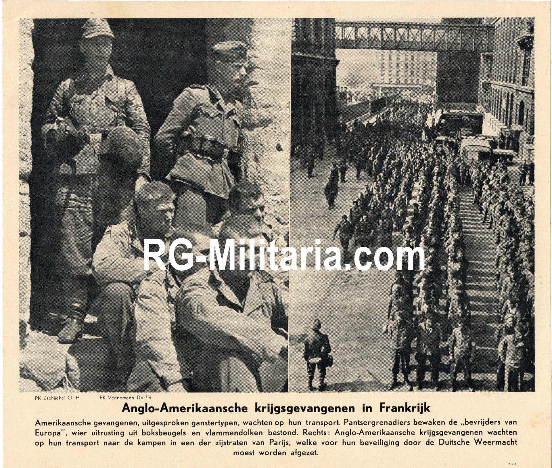 Original WW2 Dutch Waffen SS Bilderdienst Press Photo - US prisoners from Operation Overlord in Paris, France (1944)Approximately 25 x 21 cmBy SS Kriegsberichter Zschackel and VennemannPrinted on paper. Very rare Dutch variant of the Bildbericht picture with K number ''K 311 Mercurius Amsterdam.'' Operation Overlord, D-Day.Origineel Wo2 Nederlandse Waffen SS Bilderdienst Persfoto - Amerikaanse gevangenen arriveren in Parijs vanuit Normandië, Frankrijk (1944)Ongeveer 25 x 21 cmDoor SS Kriegsberichter Zschackel en VennemannGeprint op papier. Zeer zeldzame Nederlandse variant van de Duitse Bilderdienst fotos met K nummer ''K 311 Mercurius Amsterdam''. Operatie Overlord, D-Day.