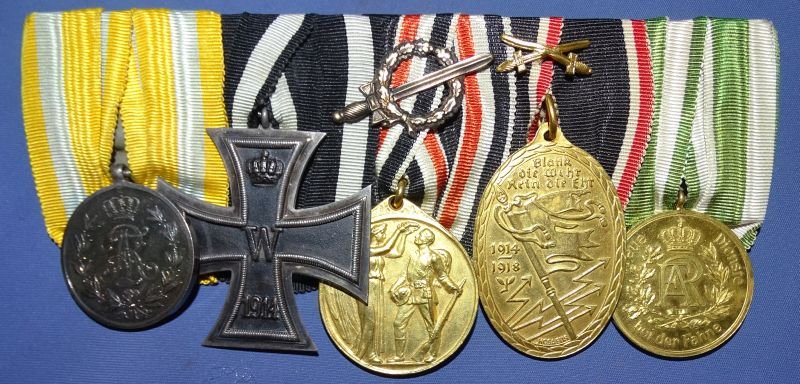 Bar includes a Saxony Frederich August Medal in silver, Iron Cross 2nd Class, 1914 Furs Vaterland Medal with sword and wreath, War Commemorative Medal of the Kyffhauser Union with Swords and Saxony 12 Year Long Service Medal. In excellent condition with minor wear.