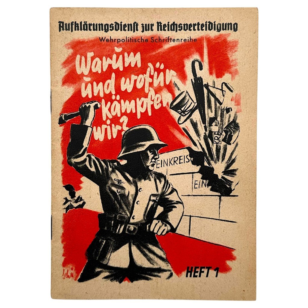 Original German propaganda brochure from Second World War, titled 'Warum und wofür kämpfen wir?' (Why and what are we fighting for?), published by the Aufklärungsdienst zur Reichsverteidigung as part of the Wehrpolitische Schriftenreihe series, Heft 1.This publication was intended to ideologically influence soldiers and civilians and to justify the German war effort.The cover features a striking propaganda illustration of a German soldier breaking through the alleged 'encirclement' of Germany by hostile powers.Inside, the brochure contains extensive text and imagery presenting the German perspective on the outbreak of the war, including strong anti-British propaganda and criticism of Winston Churchill, Neville Chamberlain and Anthony Eden.Events surrounding Poland, England and international politics are described from a German viewpoint, supplemented with photographs and speeches, including an image of Hitler in the Reichstag.The brochure remains in neat, original condition with light signs of age and use consistent with its period.A historical document and an interesting collectible from the German propaganda and information campaigns of the early Second World War.Article number: 18399Originele WWII Duitse brochure 'Warum und wofür kämpfen wir?'Originele Duitse propaganda brochure uit de vroege Tweede Wereldoorlog, getiteld 'Warum und wofür kämpfen wir?' (Waarom en waarvoor vechten wij?), uitgegeven door de Aufklärungsdienst zur Reichsverteidigung binnen de reeks Wehrpolitische Schriftenreihe, Heft 1. Deze uitgave was bedoeld om soldaten en burgers ideologisch te beïnvloeden en het Duitse oorlogsdoel te rechtvaardigen.De omslag toont een krachtige propagandatekening van een Duitse soldaat die de vermeende 'omsingeling' van Duitsland door vijandige machten doorbreekt, een typische visuele boodschap uit de beginfase van de oorlog.Binnenin bevat de brochure uitgebreide tekst en beeldmateriaal waarin de Duitse visie op het uitbreken van de oorlog wordt gepresenteerd, met sterke anti-Britse propaganda en kritiek op Winston Churchill, Neville Chamberlain en Anthony Eden. Ook worden gebeurtenissen rond Polen, Engeland en de internationale politiek vanuit Duits perspectief beschreven, aangevuld met foto's en toespraken, waaronder een afbeelding van Hitler in de Reichstag.De brochure verkeert in nette, originele staat met lichte ouderdomssporen.Een historisch document en interessant verzamelobject uit de Duitse propaganda- en voorlichtingscampagnes van het begin van de Tweede Wereldoorlog.