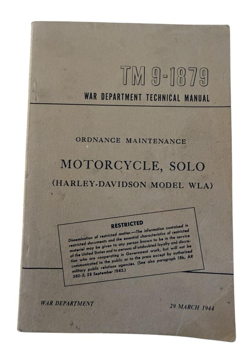 TM 9-1879 Technical Manual for Harley-Davidson Model WLA. Published by the War Department in March 1944. This technical manual is in nice used condition Hard to upgrade.