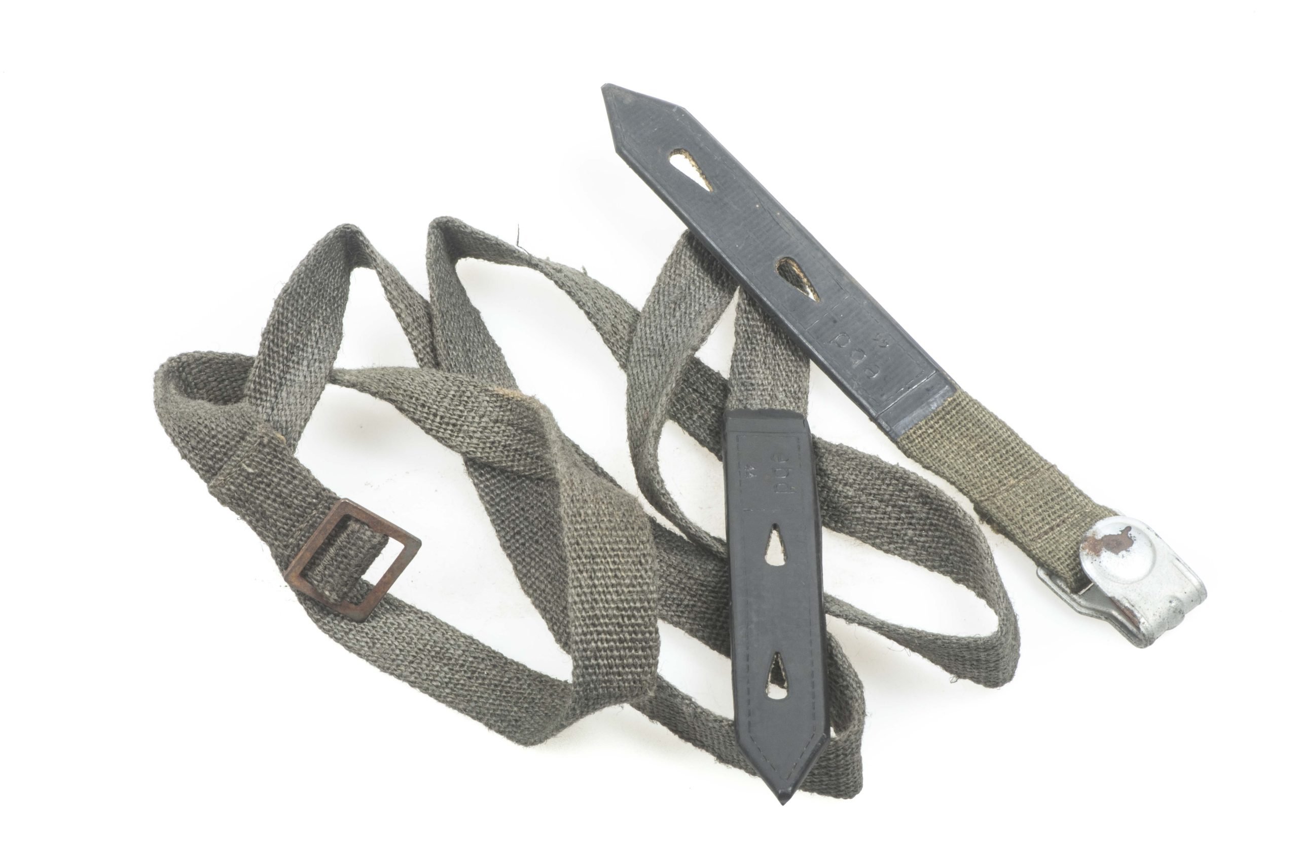 Textbook late war matching set of dark grey coloured gasmask canister straps with rubberized or rubber reinforced point. The straps are nicely marked ebd 44 which indicates productionPatra A.-G., Erzeugung techn. Gummiwaren, Napajedl/Mähren. These straps are rare to find as a marching set. Hard to upgrade set!