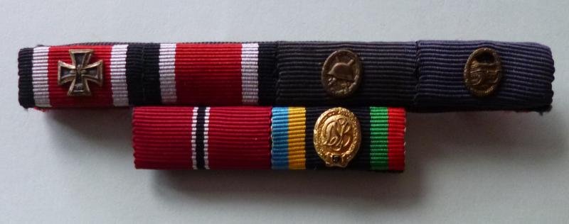 A six-ribbon-bar from a WW2 Panzer veteran consisting of the following 1957 pattern awards: 1939 Iron Cross 1st & 2nd Classes / Black Wound Badge / Panzer Assault War-badge in Bronze / Ostfront Medal & BRD DSB Sports-badge in Gold for 5 awards on the Olympic coloured ribbon.. The bar has a red wool backing with working pin & hook. Excellent condition..