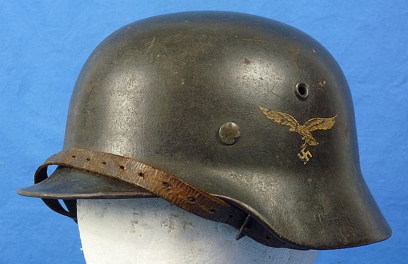 The exterior blue gray paint is approximately 90 percent intact, showing typical scuffs, spots and abrasions from field use. The toned Luftwaffe eagle decal is approximately 95 percent intact. The helmet retains its well worn liner, lacking the drawstring. The leather chin strap, also worn, is present and intact. The helmet bears the interior mark of 'ET64', reflecting a size 64 helmet shell that was manufactured by the Eisenhuttenwerke firm. The initials 'EG' are scratched into the rear interior rim. Overall the helmet is in very good field used condition.