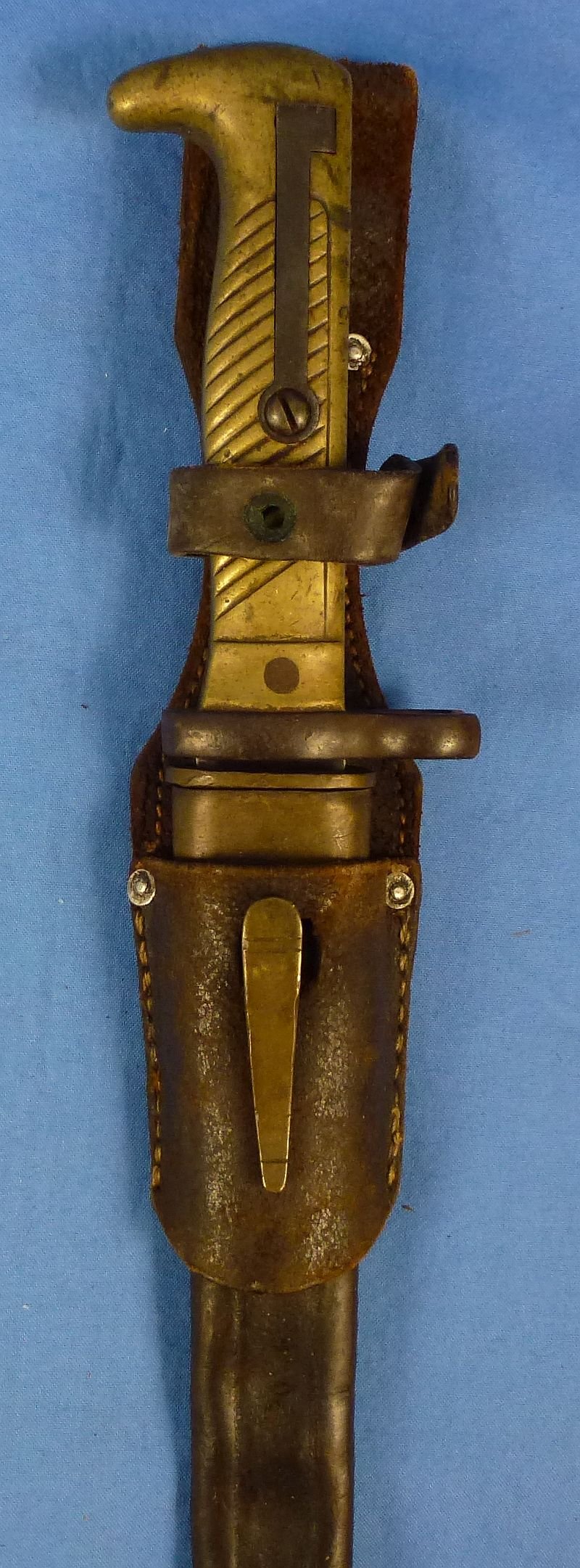 German M71 bayonet modified to 88-98/05 configuration. Spine is marked 'crown W / 73'. Reshaped brass handle. Housed in its altered leather scabbard with brass mounts and leather frog. The blade of the bayonet shows spots as well as an overall gray cast. The spine of the blade bears the imperial cypher of Kaiser Wilhelm together with the date of '73'. The brass grip as well as the guard exhibit an uncleaned patina. The guard was modified to remove a quillon and alteration of the muzzle ring to a 'rabbit ears' configuration. The leather scabbard and the frog exhibit age and use but they are complete and intact.