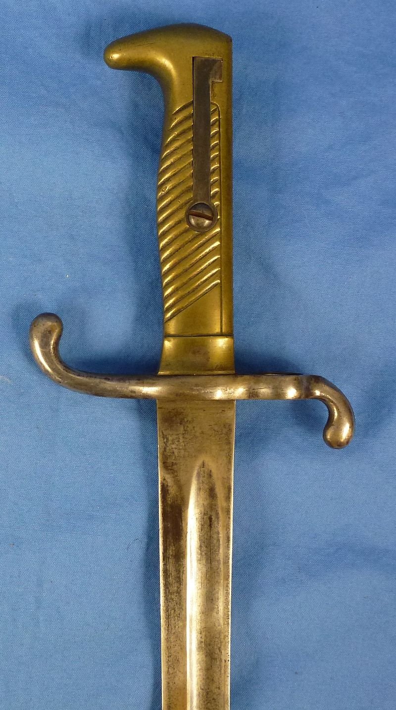 The blade of the bayonet is generally clean, showing typical spots and surface grime as well as a gray cast. The ricasso is maker marked by the firm of Wilhelm of Suhl. The spine of the blade bears the imperial cypher of Kaiser Wilhelm together with the date of '75'. The guard of the bayonet is unit marked '120 R. 15. 241:'. The brass grip as well as the guard exhibit an uncleaned patina. Overall very good condition.