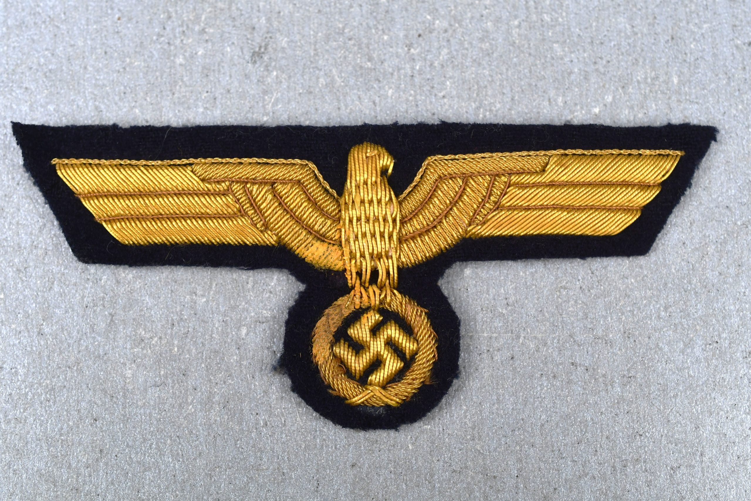 Beautiful Kriegsmarine breast eagle on navy blue cloth. Fully gold cellophane bullion embroidered example in unworn condition.