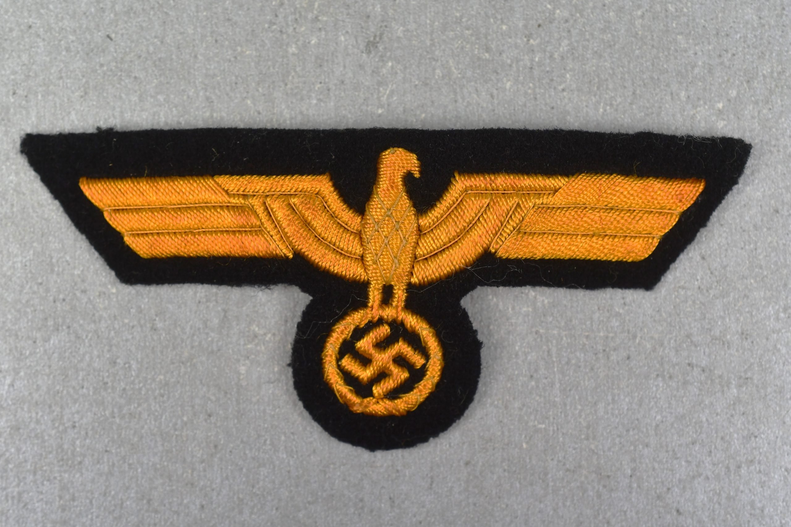 MINT and unissued KM breast eagle in excellent condition. Thick gold colored embroidered piece on navy blue wool. A stunning example, showing great detail.