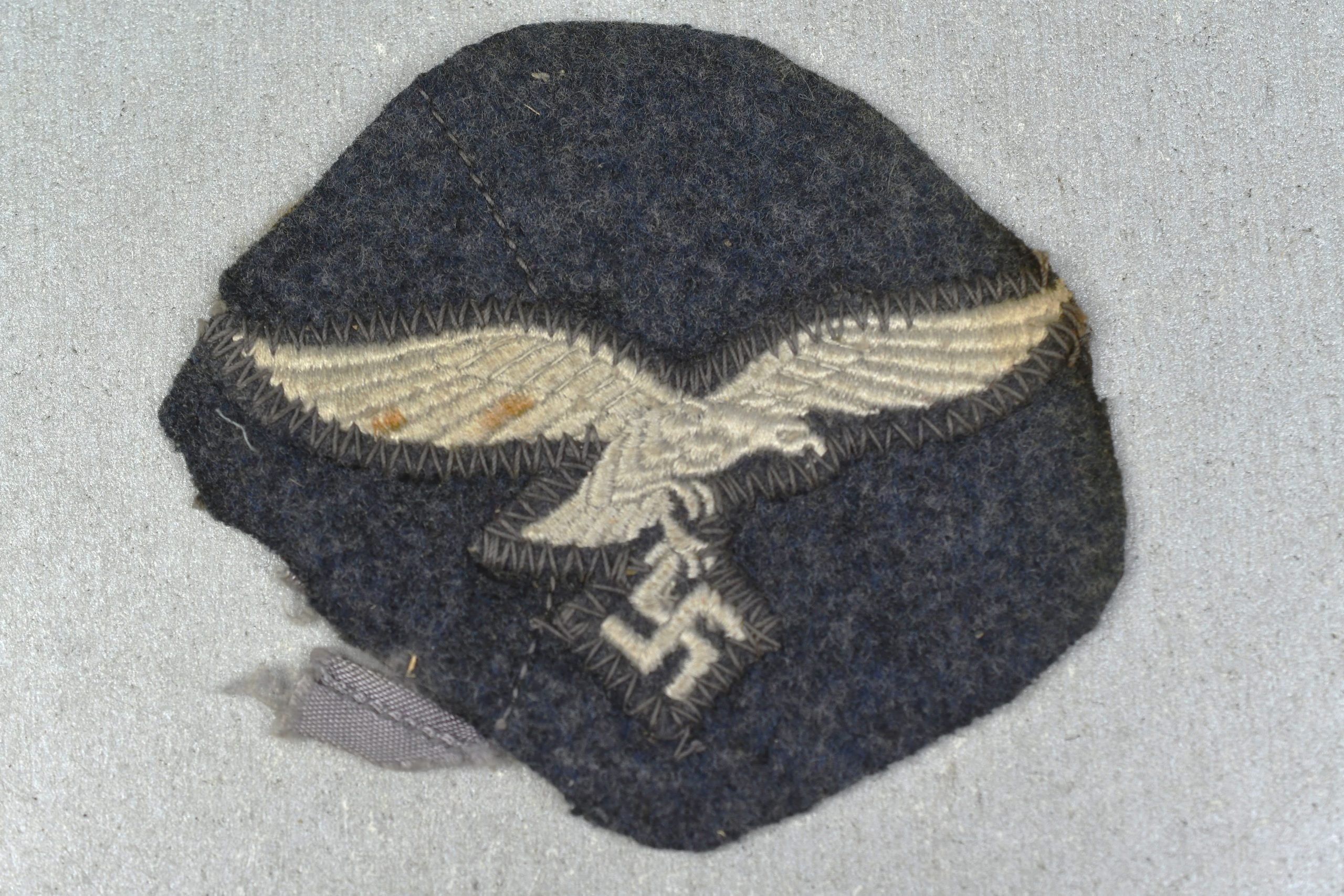 Worn standard Luftwaffe breast eagle. Machine embroidered eagle in white thread on blue felt. Textbook example, to be worn on a Luftwaffe tunic. Machine applied – in zig-zag stitiching – cut-off example, with a part of the Fliegerbluse's liner still visible!