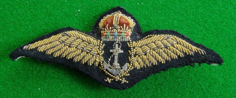 King's crown gold bullion wire embroidered pilot's qualification wings with brooch pin added to the reverse. The white metal fouled anchor within a wreath of laurel flanked by a pair of wings and surmounted by the red velvet inset crown. {Approx 9 cms wide}
