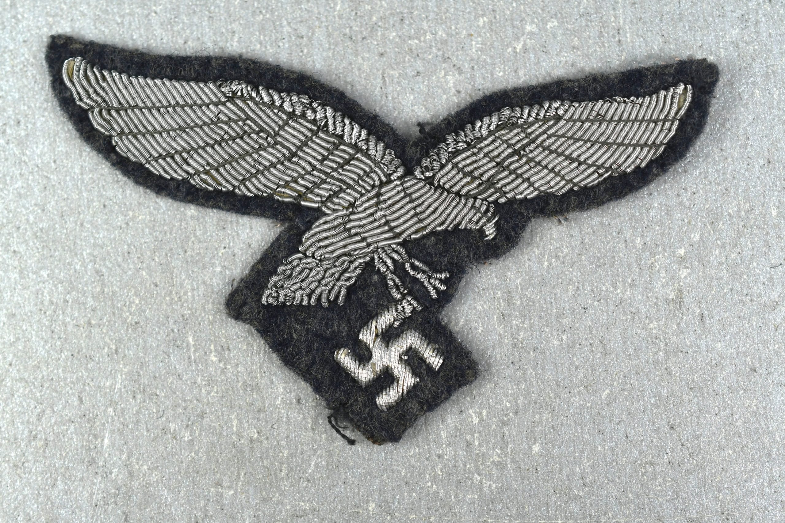 Light worn Luftwaffe officer breast eagle in good condition. Executed in silver bullion thread, hand embroidered on blue wool. Beautiful example!