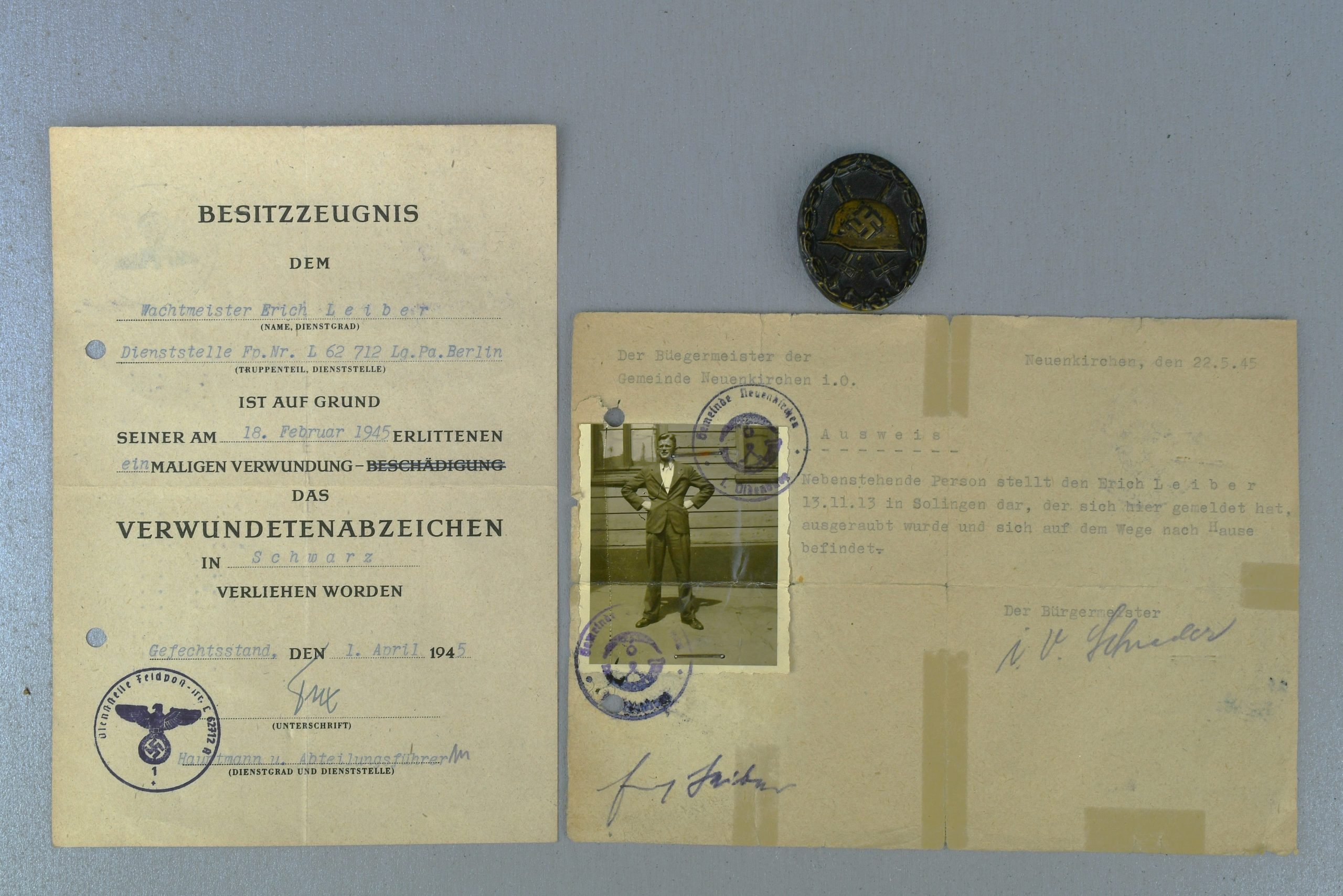 Attractive and historically interesting group consisting of a Verwundetenabzeichen in Schwarz with matching award document (Besitzzeugnis) and a late-war 'Heimatschein' / return-to-home document to Wachtmeister Erich Leiber. The wound badge document is dated 1 April 1945 for a wound received on 18 February 1945, and the Feldpost number L 62712 confirms service with Fallschirm-Artillerie-Regiment 7 of the 7. Fallschirm-Jäger-Division. This division was formed in October 1944 and saw heavy fighting on the Westfront, including the Maas bridgehead around Venlo, the Reichswald battles near Kleve, Goch and Gennep, and the later withdrawal battles toward the Rhine and into northern Germany. The badge shows honest wear with much of its dark finish remaining, matching the late-war character of the set. Westfront items from the Netherlands and German-Dutch border area are particularly sought after, making this a desirable and well-researched Fallschirmjäger related grouping with clear unit attribution and strong historical context.