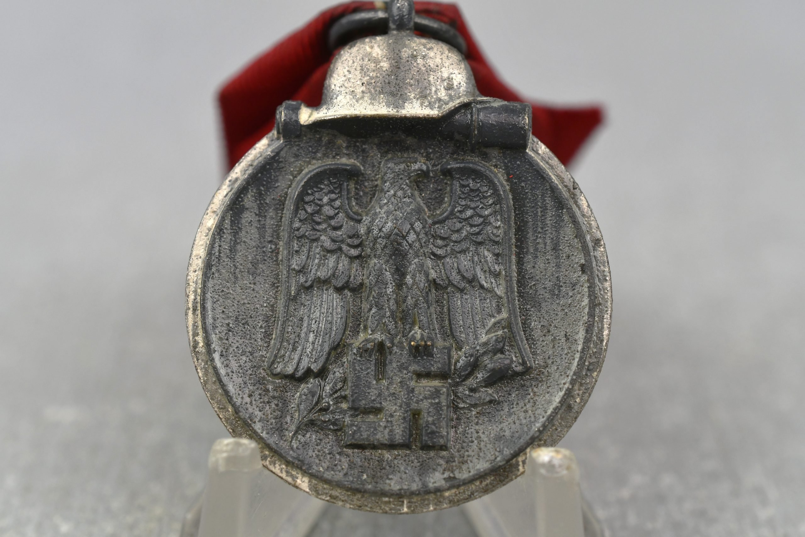 Zinc constructed medal with ribbon in good condition. Maker marked example by nr 55, J.E. Hammer & Söhne, Geringswalde.The Eastern Medal was awarded to any member of the Wehrmacht and Waffen-SS in recognition of probation in the struggle against the Bolshevik enemy and the Russian winter within the period from 15 November 1941 to 15 April 1942. It was also awarded posthumously to any service member who died in the line of duty within the Soviet Union.