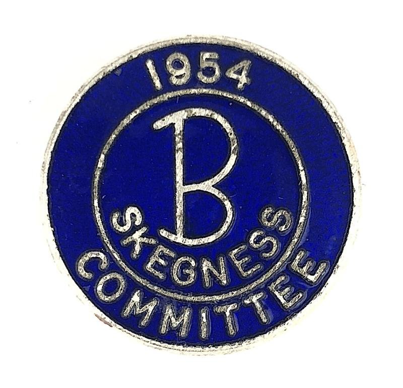 A scarce original 'Butlin's Skegness 1954 Committee badge', silver plated example inlaid with blue enamel, the reverse with maker's details 'J.R.Gaunt London'. Good condition, complete with original pin fittings, no enamel loss, minor wear.Diameter approx 20mm.