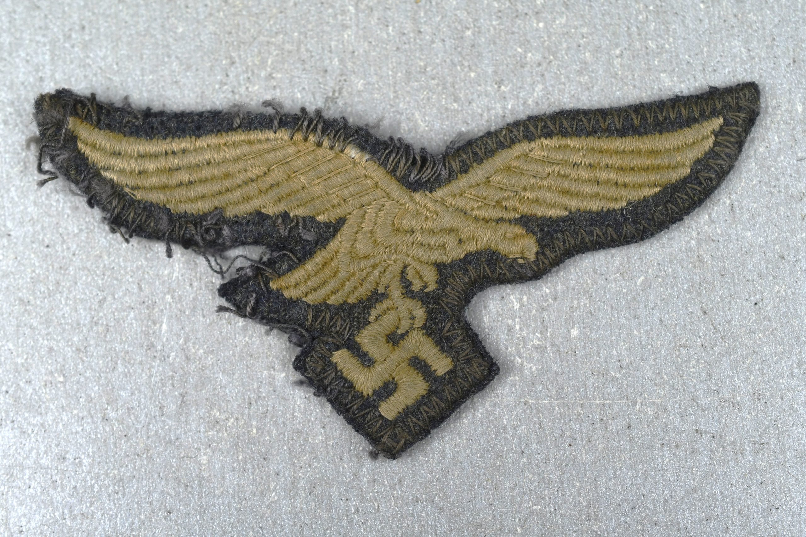 Worn standard Luftwaffe breast eagle. Machine embroidered eagle in white thread on blue felt. Textbook example, to be worn on a Luftwaffe tunic. Machine applied – in zig-zag stitiching – cut-off example, with a part of the Fliegerbluse's liner still visible!
