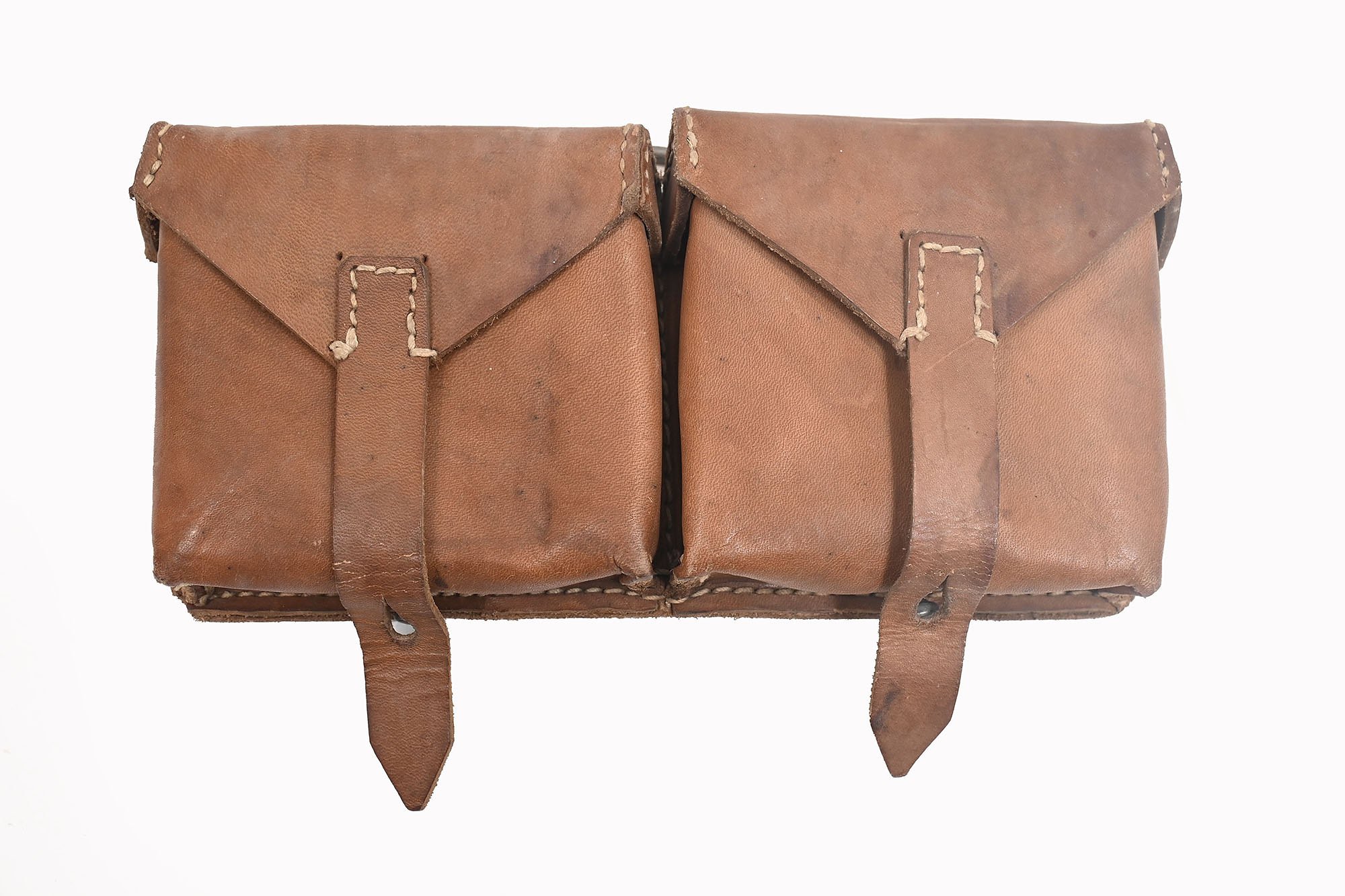 G43/K43 Cartridge Pouch (Patronentasche G/K43). Soldiers equipped with the 43 Rifle also received a specially designed cartridge pouch with two compartments. The pouch held two magazines of ten rounds (7.92 mm) and was worn on the belt. The pouches were originally made of black and brown leather, but alternative versions were soon introduced to save leather. This brown leather pouch has brown leather belt loops. The pouch is maker marked and dated 'cny 45'. The pouch is in good condition with some signs of wear from years of storage. A beautiful example in very good condition!