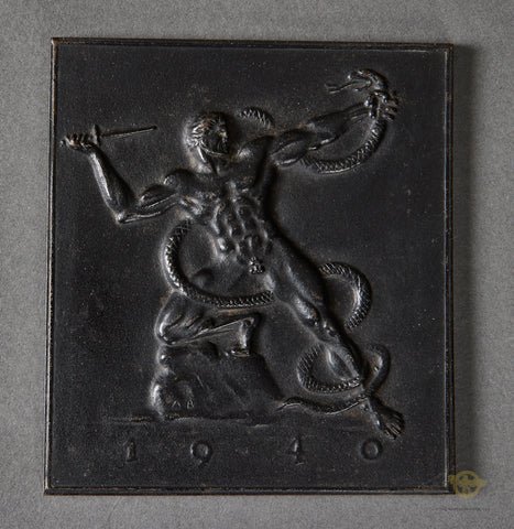 German WWII Arno Breker Plaque-This is an Arno Breker sculpture, he was a prominent German sculptor known for monumental works during the Third Reich. This plaque was created in 1940 and is known as Der Rächer or 'The Avenger'. It shows a heroic muscular warrior combatting serpents, which symbolizes a fight against evil. In this case, the warrior is Germany, and the serpent represents England. This is made of steel, with excellent details. It is very nicely maker marked on the reverse. This is excellent.