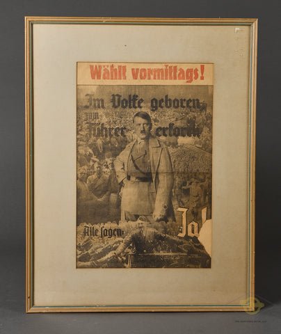 German WWII Hitler Propaganda Poster-Wait until you see this early Hitler poster. This would be hung all over the place to promote people to vote for Hitler. The top of the poster reads 'Wählt vormittags' in red, this translates to VOTE IN THE MORNING!! The text below reads 'Im Volke geboren, zum Führer erforth' / Alle sagen/ Ja or Born from the people, educated to be the leader. Everyone says Yes!This poster has faded from age and storage, and there is a tear just at the lower right hand corner, so please be sure to look closely at the photos.This does not affect the many images of Hitler, there is one in the center, and more of him giving a speech, riding in a car, marching, etc. The poster itself measures 16 inches (40.64cm) long and 10 ½ inches (26.67 cm) wide. The tan colored matte measures 3 inches (7.62 c) wide. The large tan with green striped frame measures 23 inches (58.42cm)long by 17 ¾ inches (45.085 cm) wide. It is covered in glass. The frame is backed in brown paper on the reverse. There is no device for hanging this frame, no hook or wire. This is a very unique item that is in good condition.Definitely a one of a kind piece.