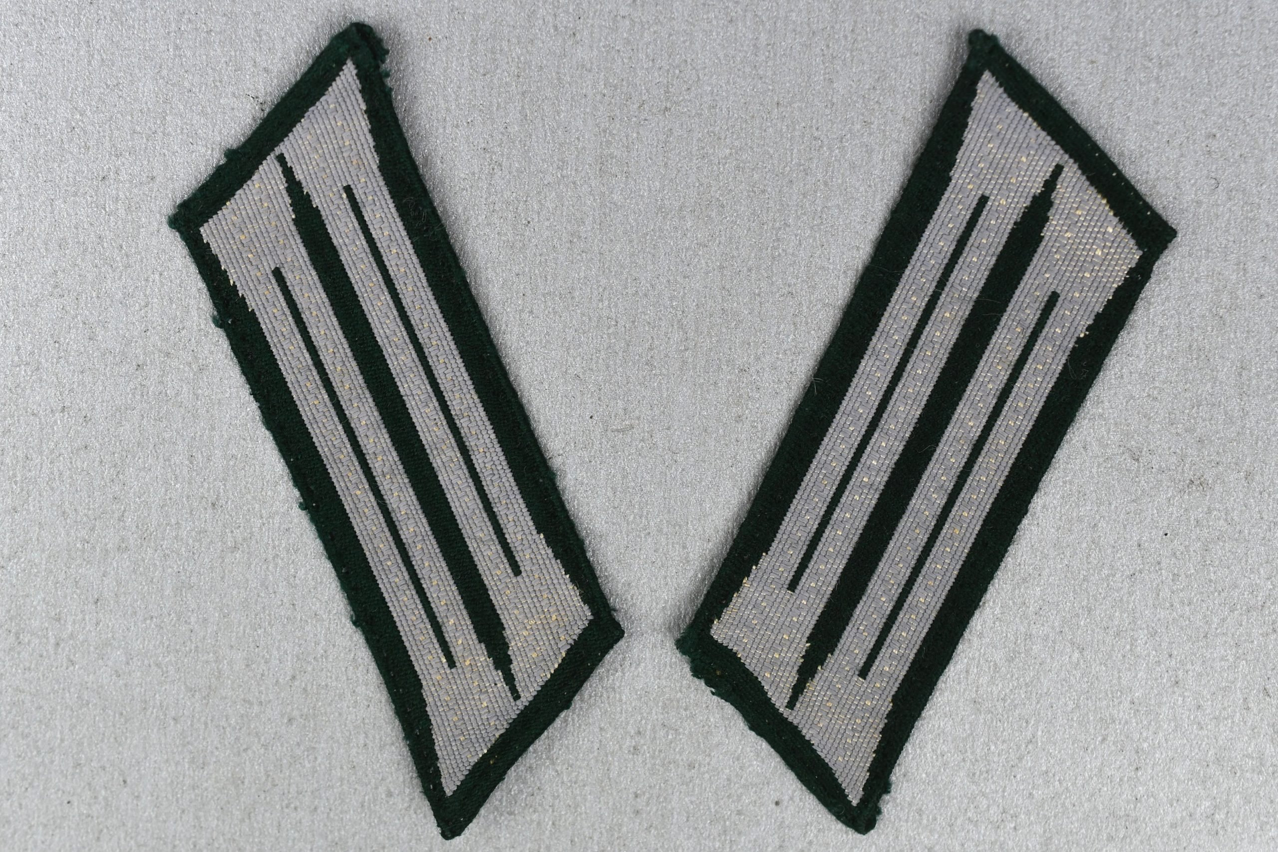 Light worn pair of rarely seen flat woven 'BeVo'-weave M38 army collar tabs for all branches of the German army (Heer). Perfect for any M36-M40 tunic. Extremely hard to find a set of M38 collar tabs today.From 1933 until approximately 1938 army units got their 'waffenfarbe' or weapon color shown on their collar tabs. Because many soldiers kept changing units, it was decided that the collar tabs would not bear any specific color anymore. Therefore the M38 generic collar tabs were introduced with no weapon color, so only the piping on the shoulder boards would indicate the branch of the soldier. The tabs had a white/grey background and three dark green colored stripes. Because the white background of the M38 tabs was lighting up in the dark, the brown/grey colored M40 generic collar tabs were introduced in the late 1940's.