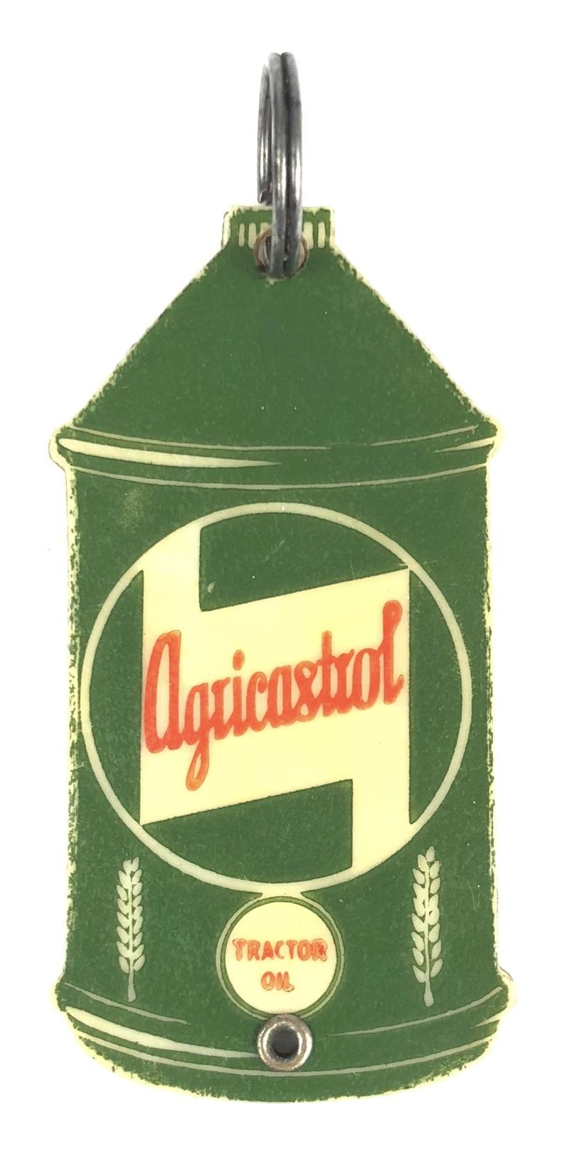 A very scarce original vintage period 'Agricastrol Tractor key ring badge', large green celluloid two part example in the form of an oil can, the top hole bearing a steel split ring. Good condition, minor service wear, celluloid backing plate with small split to top point.Height with ring approx 70mm.