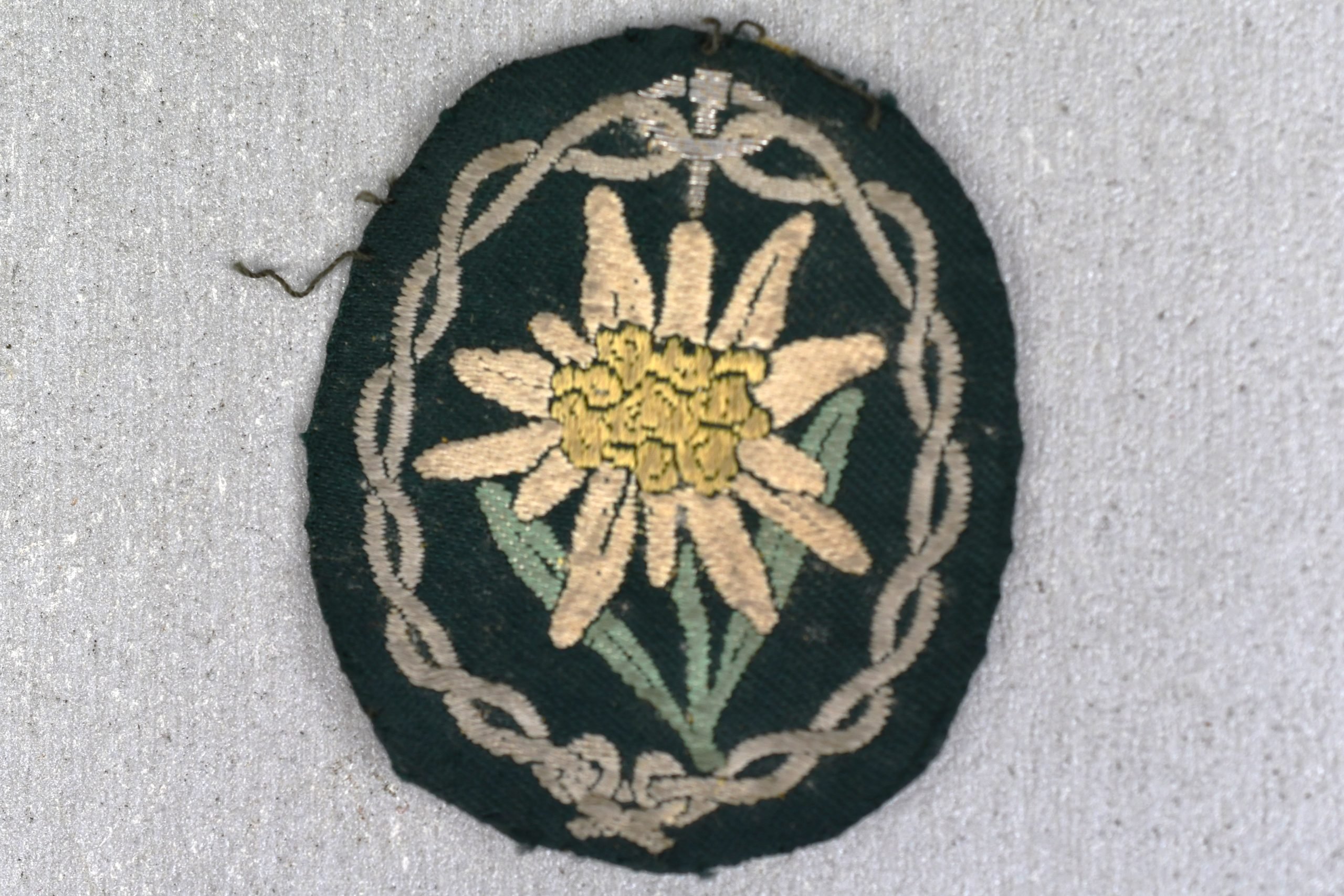 Mountain trooper 'Gebirgsjäger' flat woven 'BeVo-weave' sleeve edelweiss patch in perfect, light worn condition. Uniform removed. A pristine example!